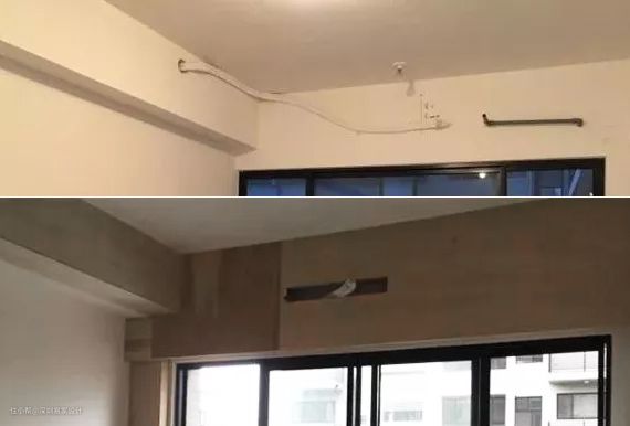 下图是遇到空调洞距离空调位置远的情况,让木工提前做造型设计,但是需要注意这种做法需要空调管路提前预埋(安装空调的时候可能会单独产生费用),留出空洞,保证空调刚好遮挡住