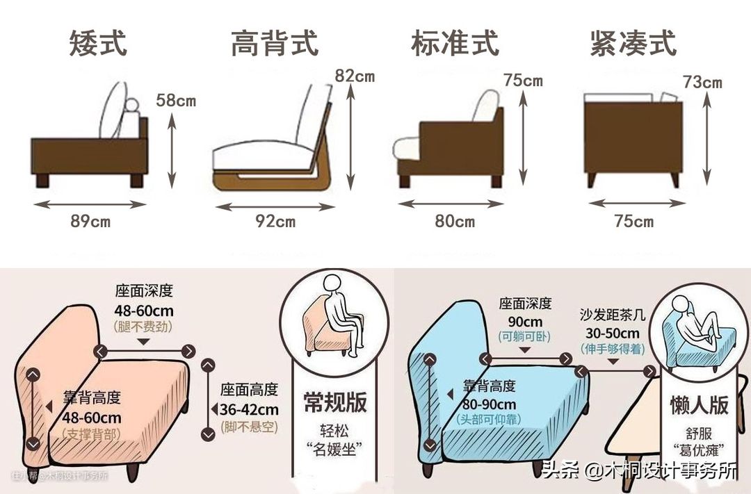 •沙发的宽度(W)和高度(H)根据沙发外观不同,大致分为四类:矮式(W:89cm H:58cm