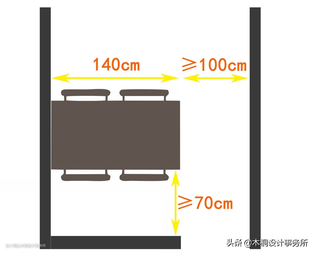•餐桌与墙面之间至少需要保留70cm的间距,用于椅子拉出,保证正常的就餐,过道不小于100cm。