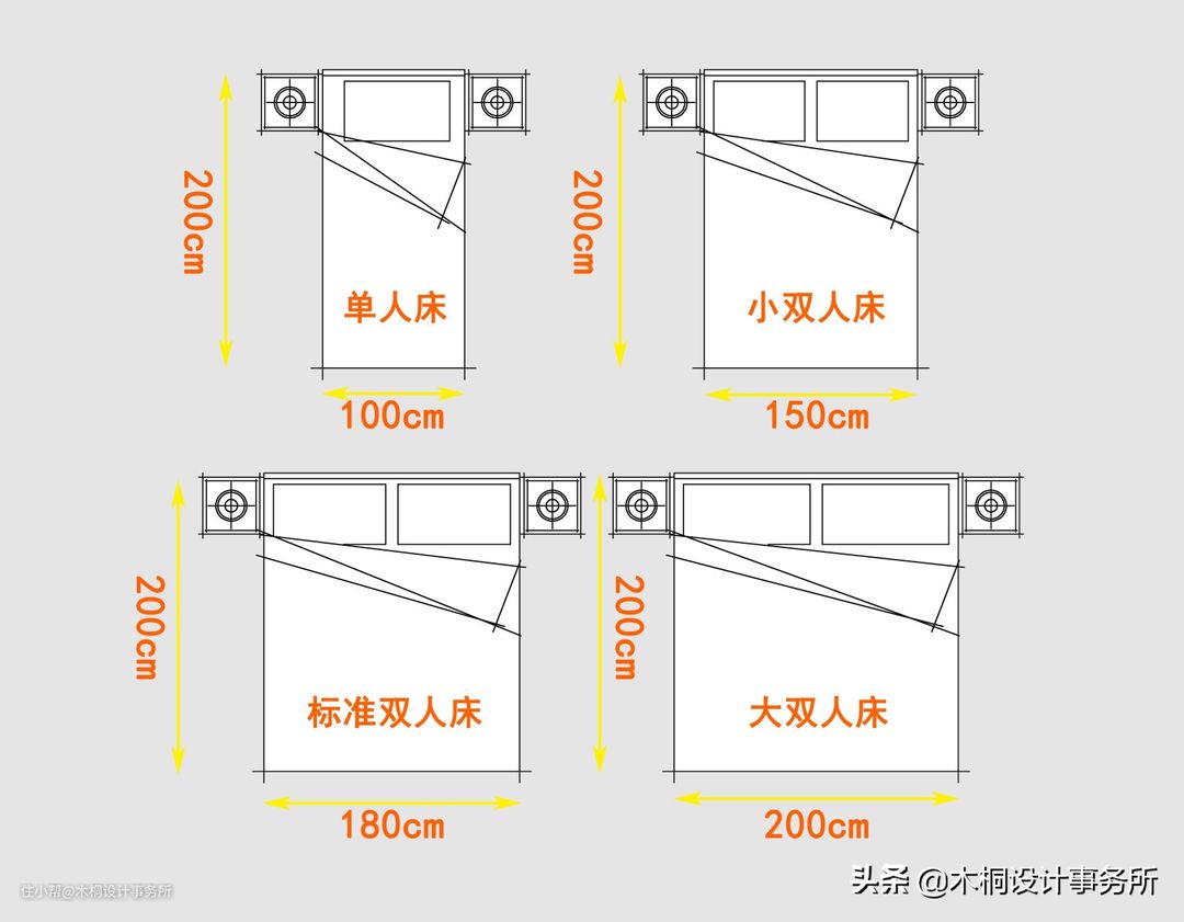 •成品床根据使用人数一般分为:单人床(100cm*200cm)、小双人床(150cm*200cm)、标准双人床(180cm*200cm)、大双人床(200cm*200cm)。