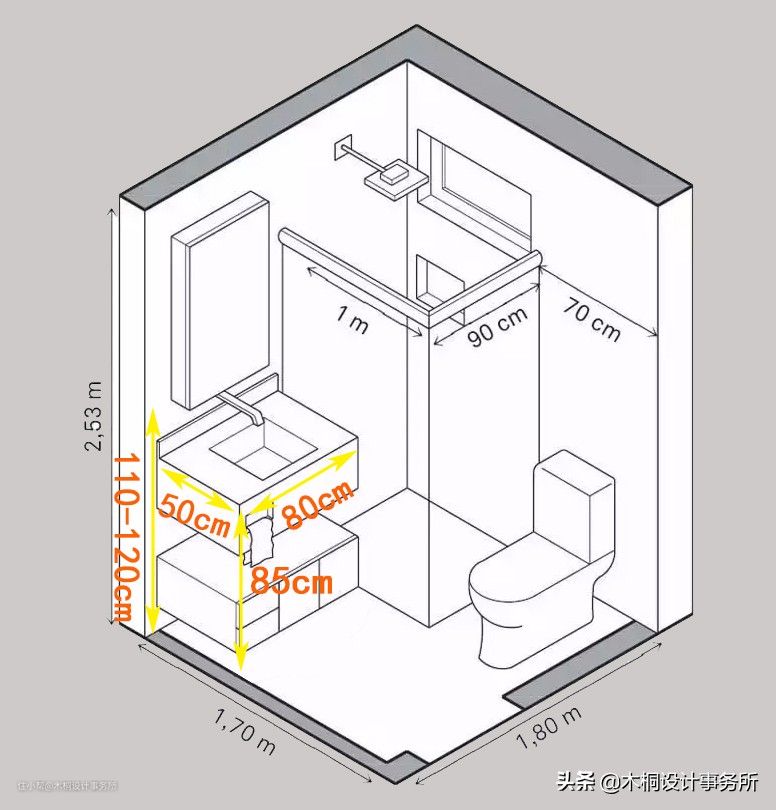 •马桶区左右两边宽度不小于75cm,马桶边与对面墙体间隔的距离不少于45cm。