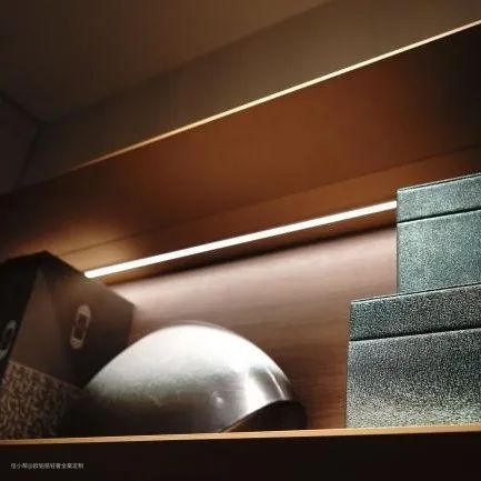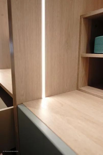 内嵌灯带常用于衣帽间里。层板内嵌式的LED线形灯带,观感精致,更能体现空间的高级氛围。除了照明展示、解决视觉盲区的作用之外,带着柔和光晕的线条与柜身的纹理交织,也能弱化空间的封闭感。