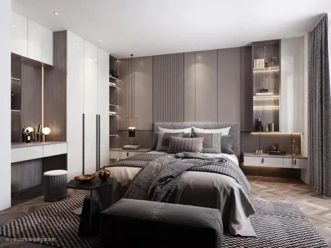 怎么在卧室实现五星级酒店房间般的氛围?不妨选择色温偏暖的台灯来营造温暖气氛。风格沉稳的衣柜、床头柜,配上柔和光线、特别的台灯造型,能相得益彰。