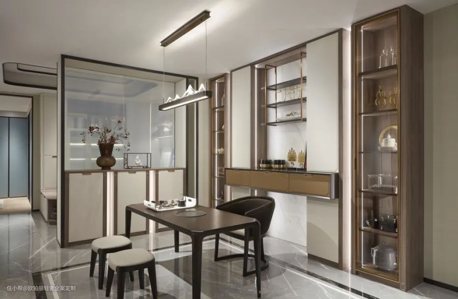 我们家中常用收纳柜来储存杂物,随处可见的组合柜就像空间中的主角。发挥灯光的作用,展现出柜子的肌理与光泽,为空间增色不少。