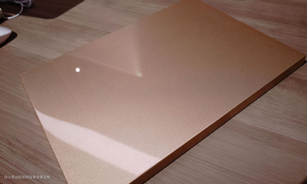 与烤漆板质感接近,表面流平性、镜面效果好,光泽度高。