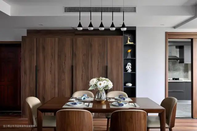 ▲餐厅旁边的木色收纳柜,加入黑色的开放展示架,摆上陶艺品的装饰,也增添了空间的艺术与端庄感。