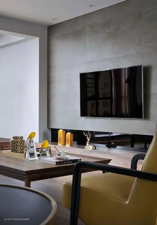 ▲电视墙是灰色的岩石板的材质,加入地台设计与壁挂电视机,显得极简而小资。客厅中间摆上一张实木茶几,摆上精致的摆饰品,也让空间显得更加优雅端庄。