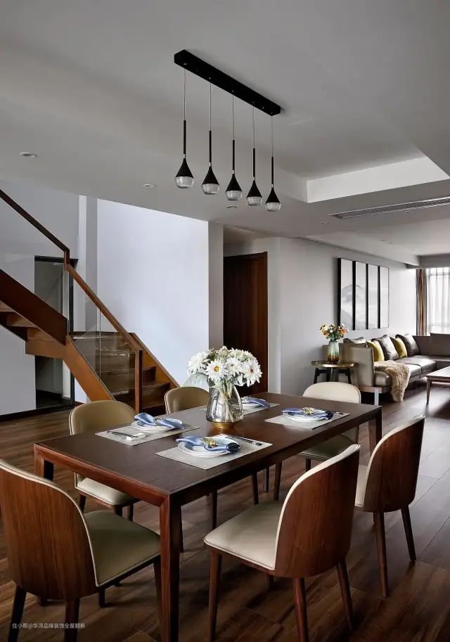 ▲餐厅设置在楼梯旁边,整体木色的地面与楼梯,布置木质餐桌与皮艺坐垫的餐椅,也是营造出一个端庄精致的用餐空间。