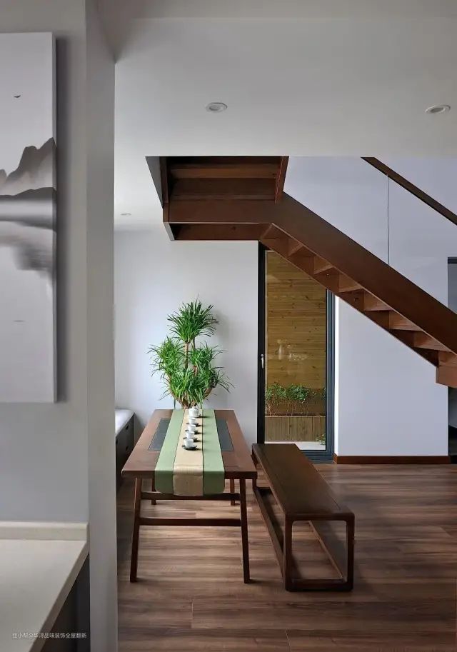 ▲品茶区设置在餐厅旁边的角落里,刚好是楼梯下的空间,又挨着窗户有着较好的采光,靠窗定制卡座窗台,布置上茶台与板凳,提供了禅意舒适的品茶聊天区域。
