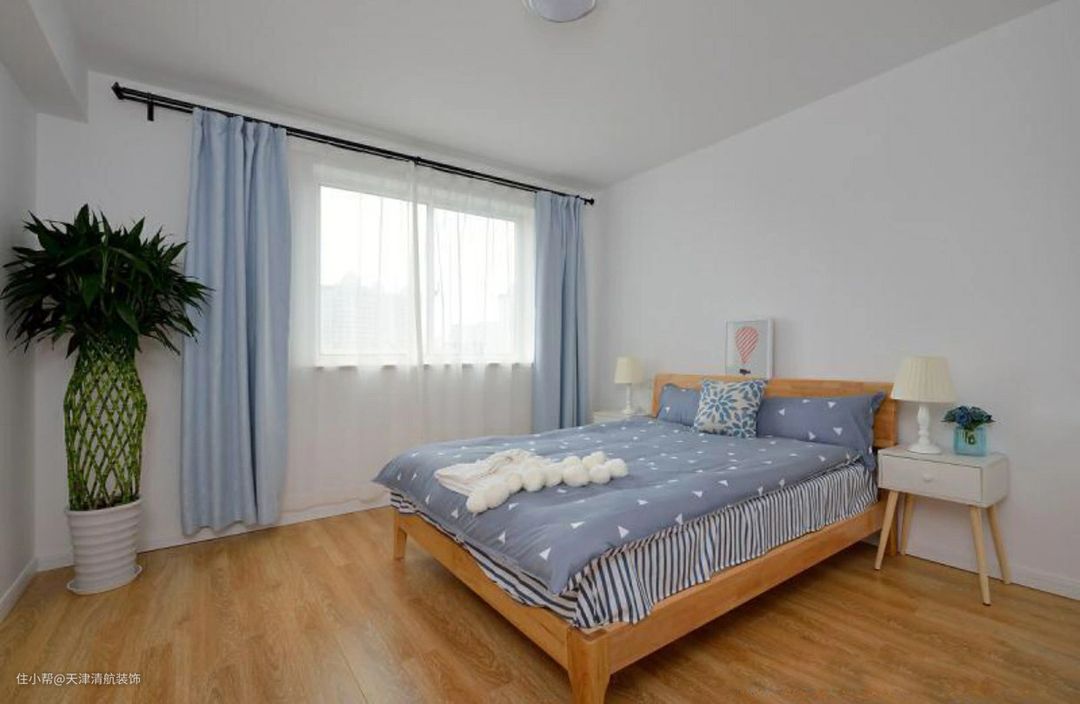 主卧空间相对比较大,拥有独立的小衣帽间,储物空间是足够的。定制的衣柜直接到顶,没有浪费一点空间,与墙面完美搭配,看着形成一个整体的感觉。地面铺木地板的感觉真的太舒适了,没有瓷砖那种冰冷的感觉,有助于睡眠,未来生活更幸福。