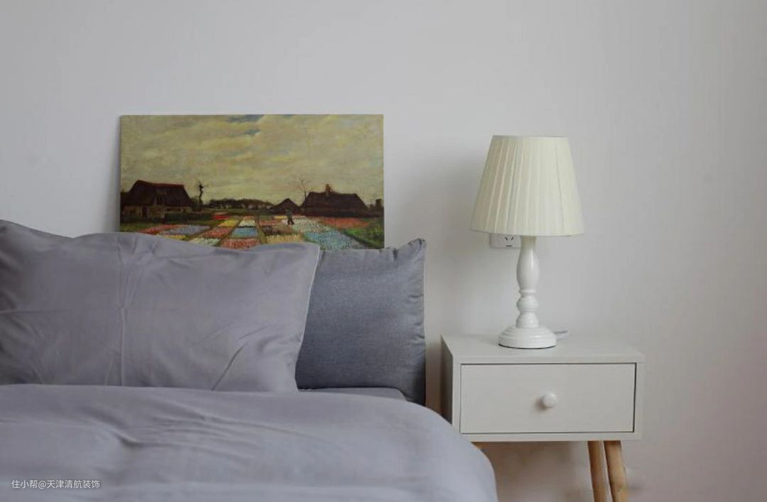 布置了灰色的床上四件套,没有任何的图案,与地面的原木木地板搭配。床头两边布置了床头柜,放着台灯,晚上可以增加二次照明。到时候可以把墙上的油画挂上去,效果会更完善。