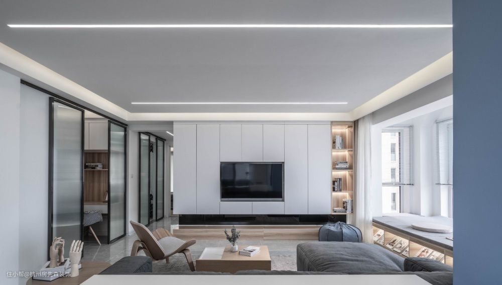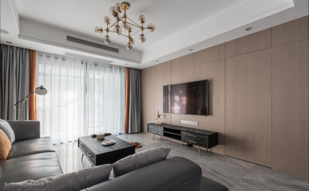 电视背景墙还可以定制一个柜子,一整面墙电视柜设计可以增加很多储物空间,同时又可以起到很好的装饰作用,定制的时候注意一下分区布局,建议80%有门板,20%开放无门板,这样会显得整齐一些。
