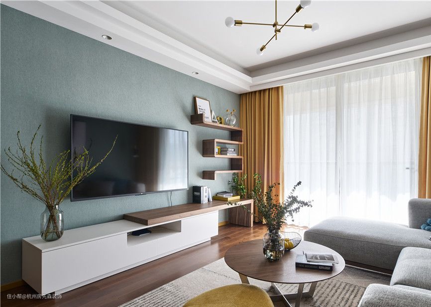 客厅电视背景墙可以刷一面有颜色的墙,这种颜色可以你考虑和其它墙面颜色一样,也可以选择比其它墙面深一点的颜色,只要不要太撞色就可以了。