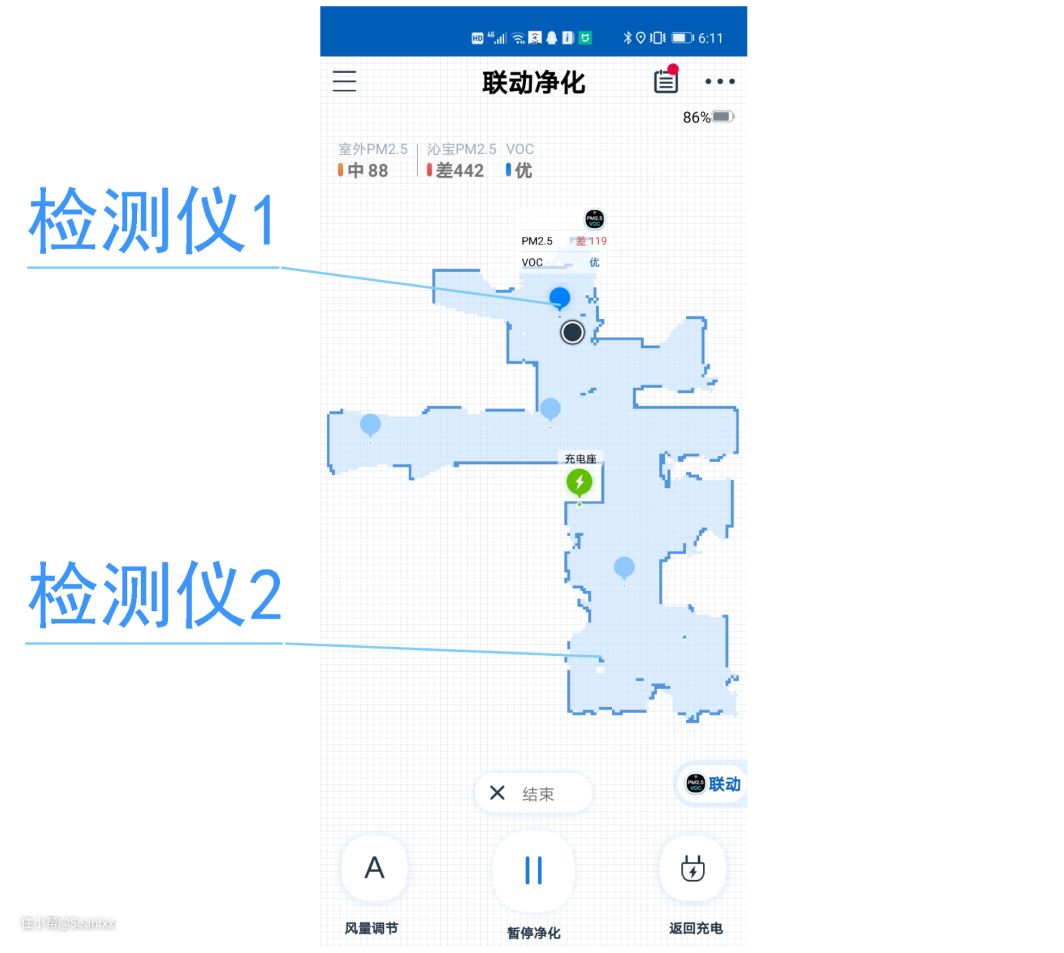 - 机器与检测仪联动,可以及时抵达污染源位置采取措施,在扩散到全房之前控制住污染物,减少之后的工作量,有不错的效率。