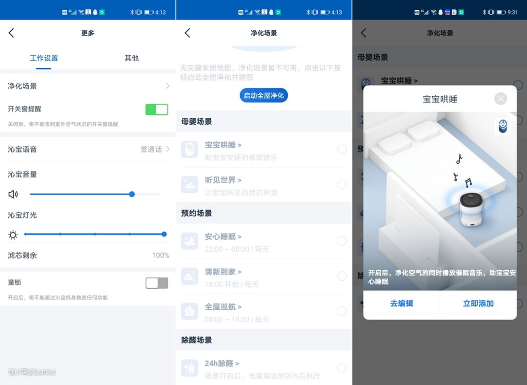 APP端提供的设置比较细致,带有音量、童锁等常用功能,预置了几个净化场景,其中母婴场景还不错,可以边净化边播放音乐,且会进行工作噪音控制,工作时在低风速下进行,避免扰民,比较人性化,这让身为孩子的父亲的我十分放心。