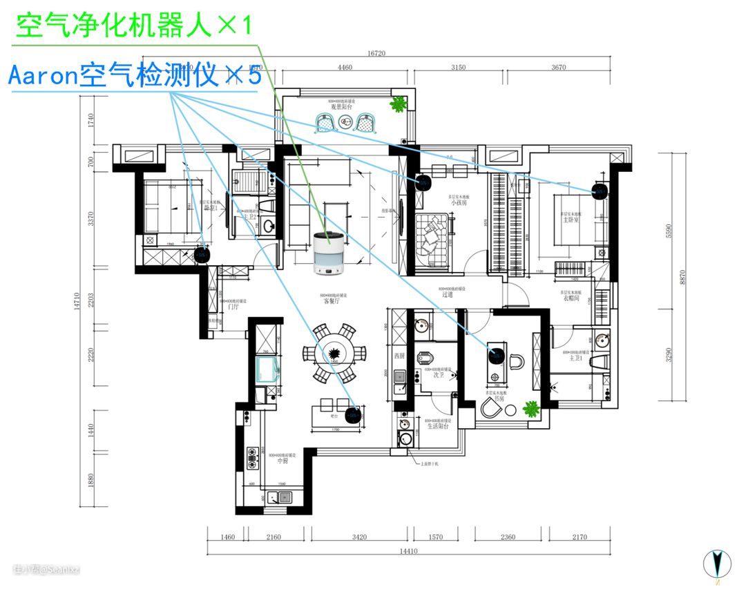 不过我的室内有客厅+餐厅+开放式厨房+阳台加起来有70平米的超大连通空间,一台净化器是绝对不够的,从效果和均匀性来考虑需要安排两台,全房净化要有比较好的体验的话得要差不多6台净化器。