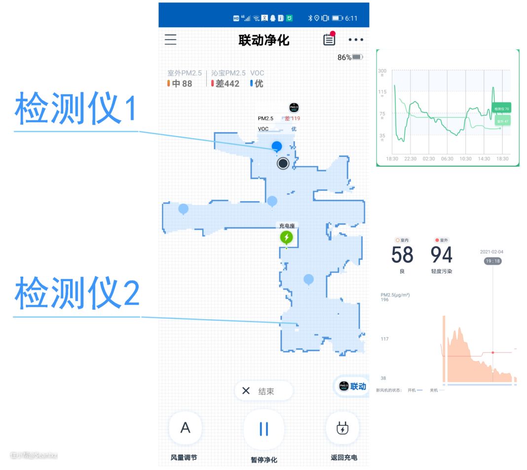 可以看到,餐厅煎羊排位置从爆表降到了20附近,净化器回到了充电座位置后又有反弹,因为厨房的油烟也进入了餐厅空间,于是沁宝在净化完客厅之后又回到餐厅继续净化。