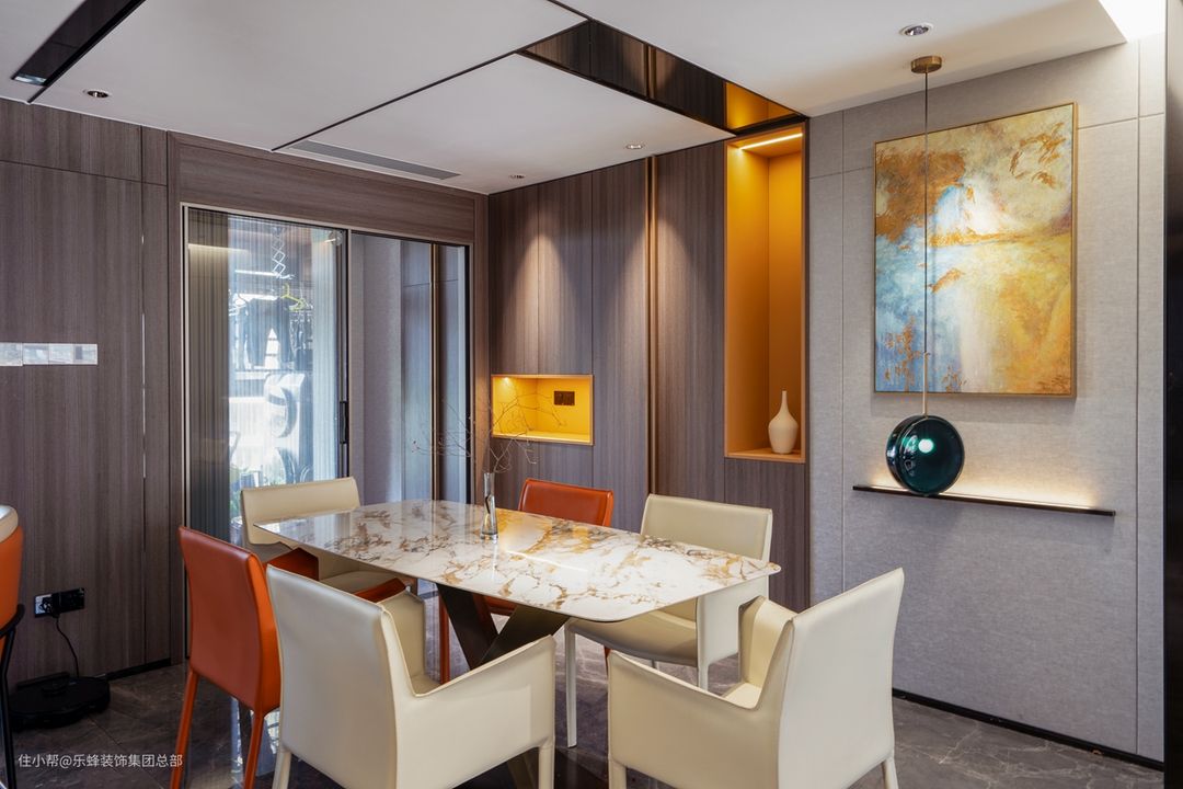 餐厅餐桌处采用黑金色纹路与大理石的材质结合,迎合整个空间的奢华感,凳子采用撞色系,墙体的壁画与柜体的设计,奢华中给家赋予更多温暖的艺术气息。