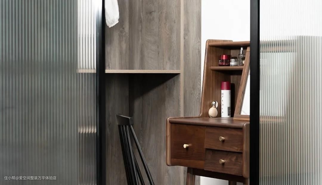 简约的小实木梳妆台,多个抽屉和隔层可以收纳物品,再搭配北欧风的靠椅,静静的藏在衣柜里。