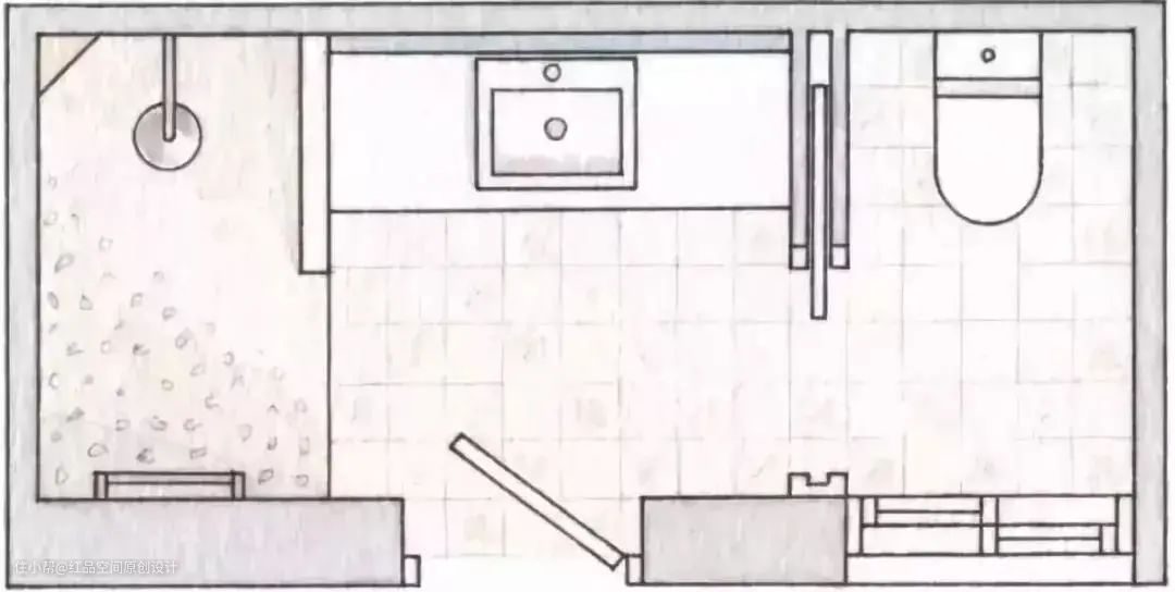 如果长方形卫生间的空间比较小做不了干湿分离的话,在布局上是可以先浴室柜、马桶再淋浴区。