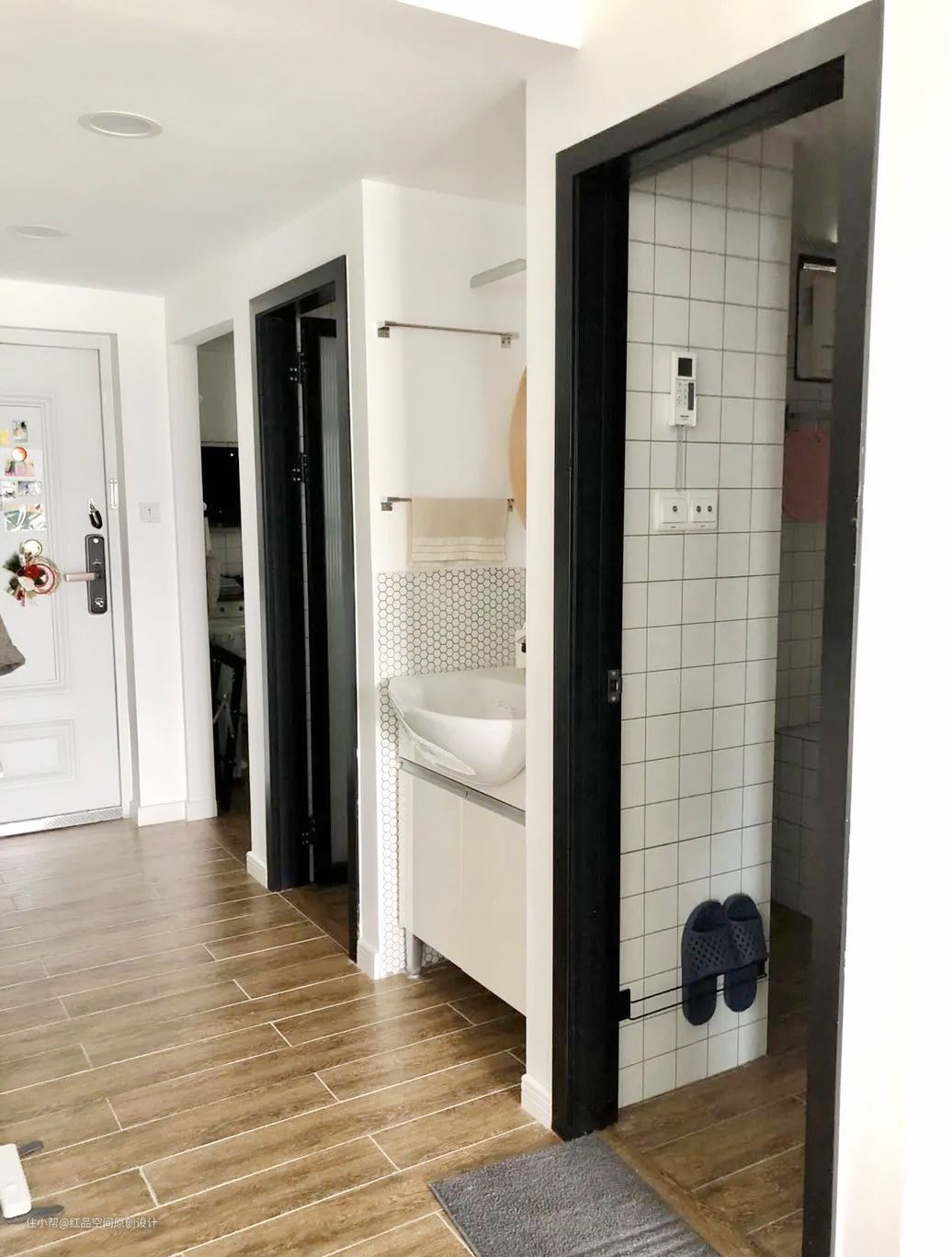 巧妙利用正方形卫生间,将左右两边设置成马桶区和淋浴区,中间是浴室柜,这样很省空间也非常实用。
