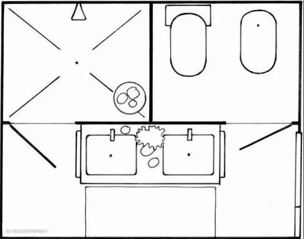 也可以将淋浴区放到中间,左是马桶区,右边是浴室柜。或者,左右两边是浴室柜和马桶,尽头是淋浴区,这样布局设计也很省空间。
