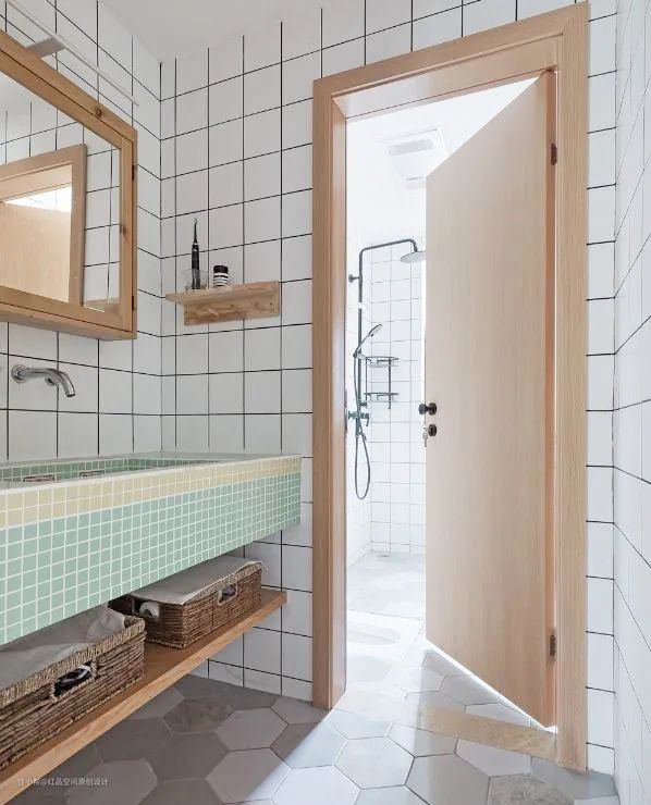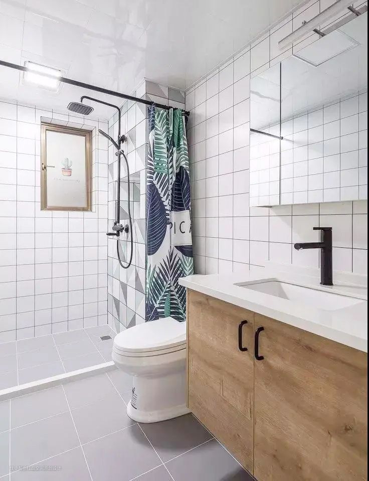 将淋浴区防水条做高,防止水蔓延到别的地方,但是要注意通风散朝,防止浴巾发霉。