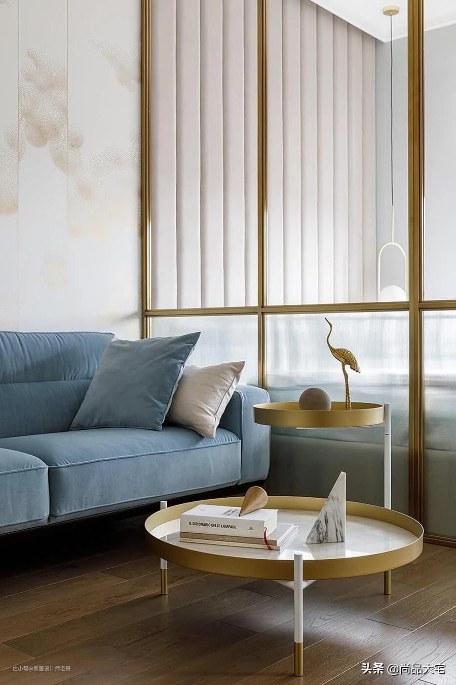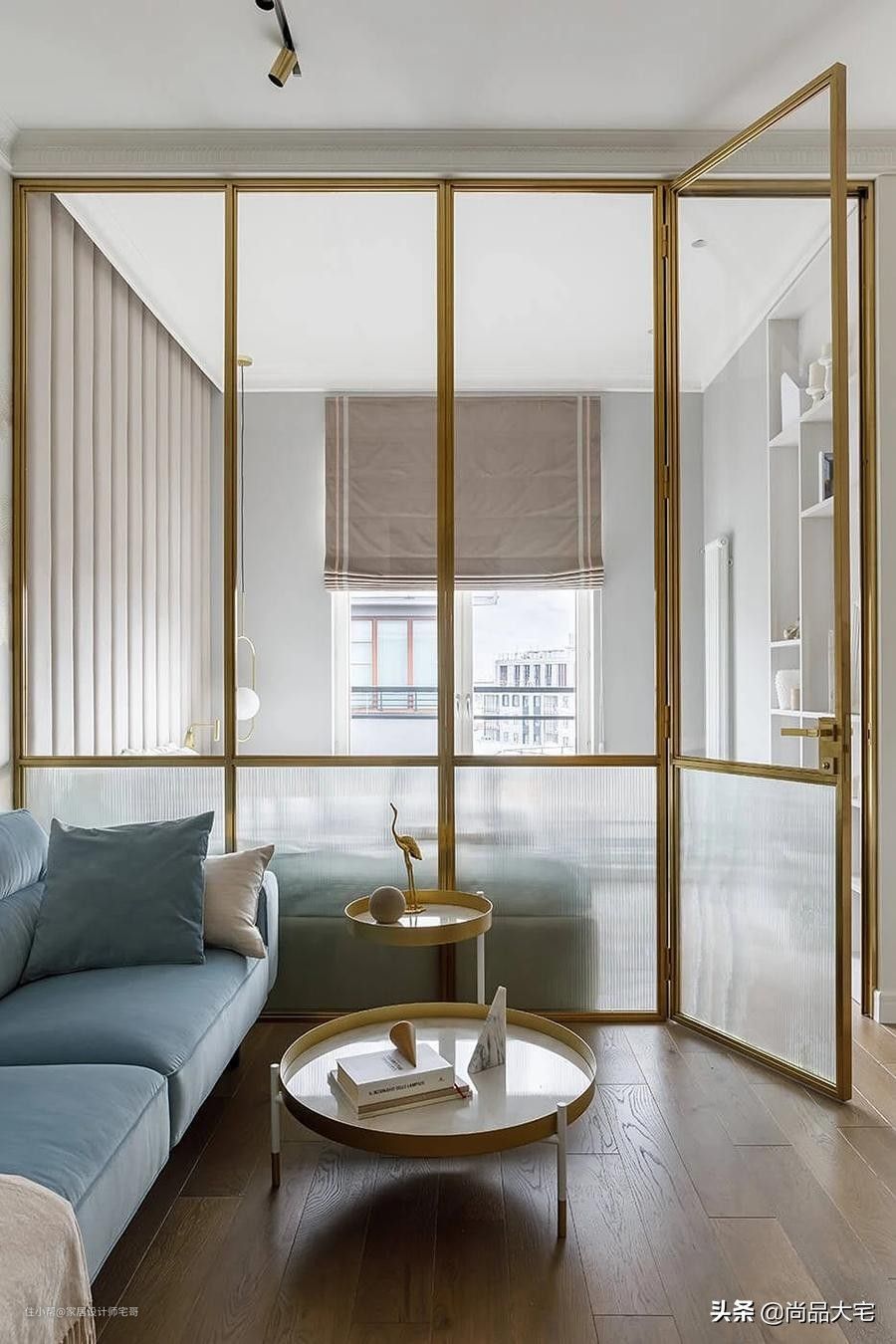 客厅与卧室之间,用带金属边框的玻璃隔断隔开,玻璃门下方是长虹玻璃,保障卧室的隐私,上方使用透明玻璃,让空间更加通透明亮。