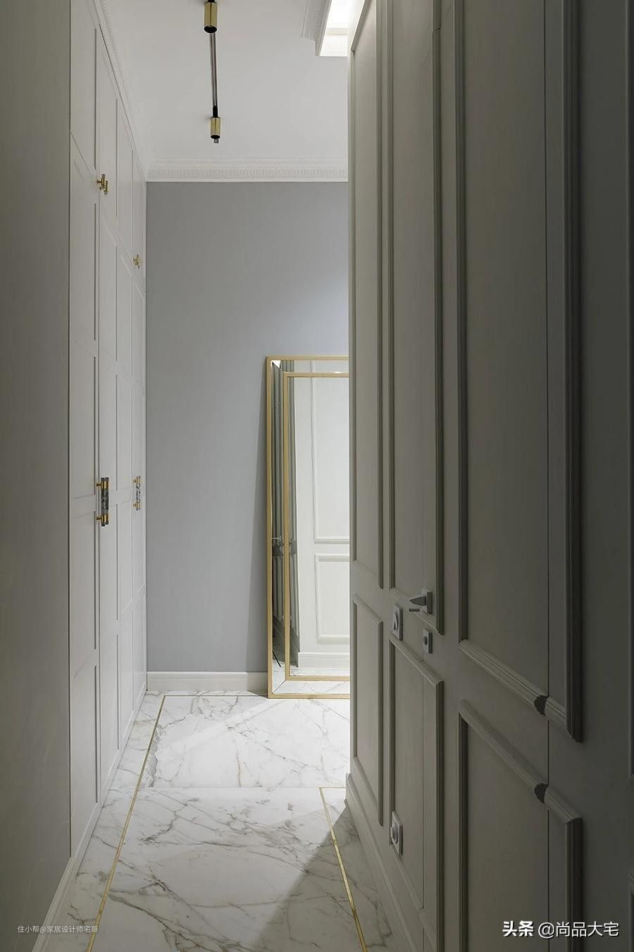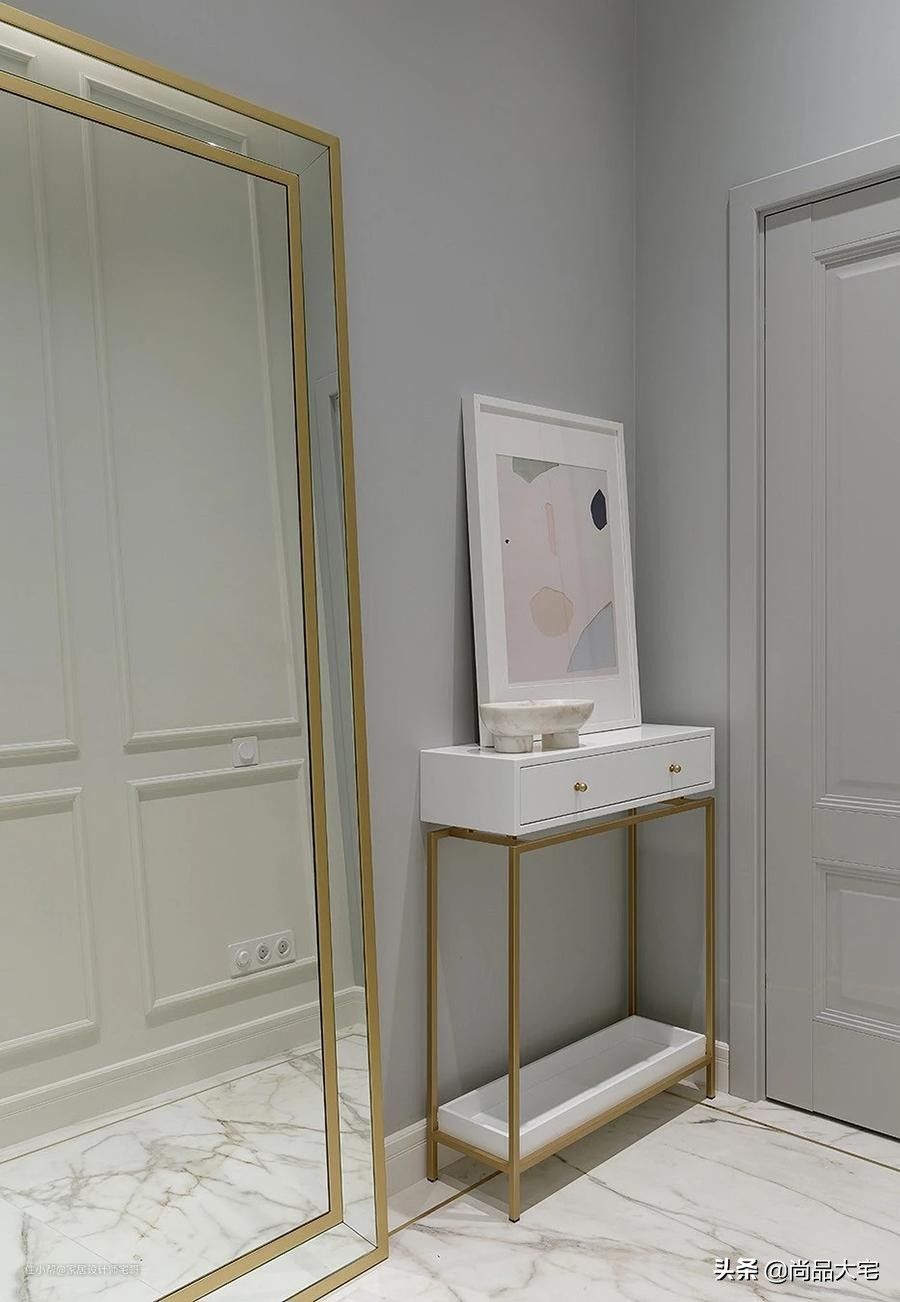 入户玄关整体以浅灰色为主色调,墙面利用石膏线条作为装饰,简约大气又美观。入户门右侧摆放了一个玄关柜和一面全身镜,黄铜色的金属边框,淡化了整体灰白色的空间给人的冰冷感,轻奢大气。