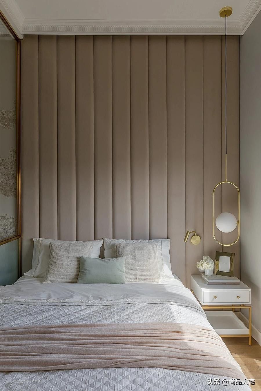 床头的单边床头柜搭配黄铜色的壁灯与精致的吊灯,奢华大气又不失精致感。