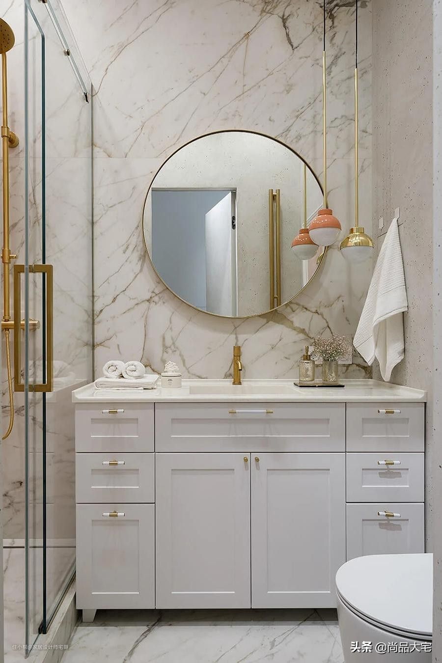 正对卫生间门一侧的墙边摆放了一个收纳空间超大的浴室柜,浴室柜上方圆形的浴室镜增添了空间的精致感。黄铜色的配饰充斥着卫生间的每个角落:柜门把手、水龙头、吊灯、毛巾架、花洒,搭配白色浴室柜和马桶以及瓷砖,一种轻奢感扑面而来,精致又大气。