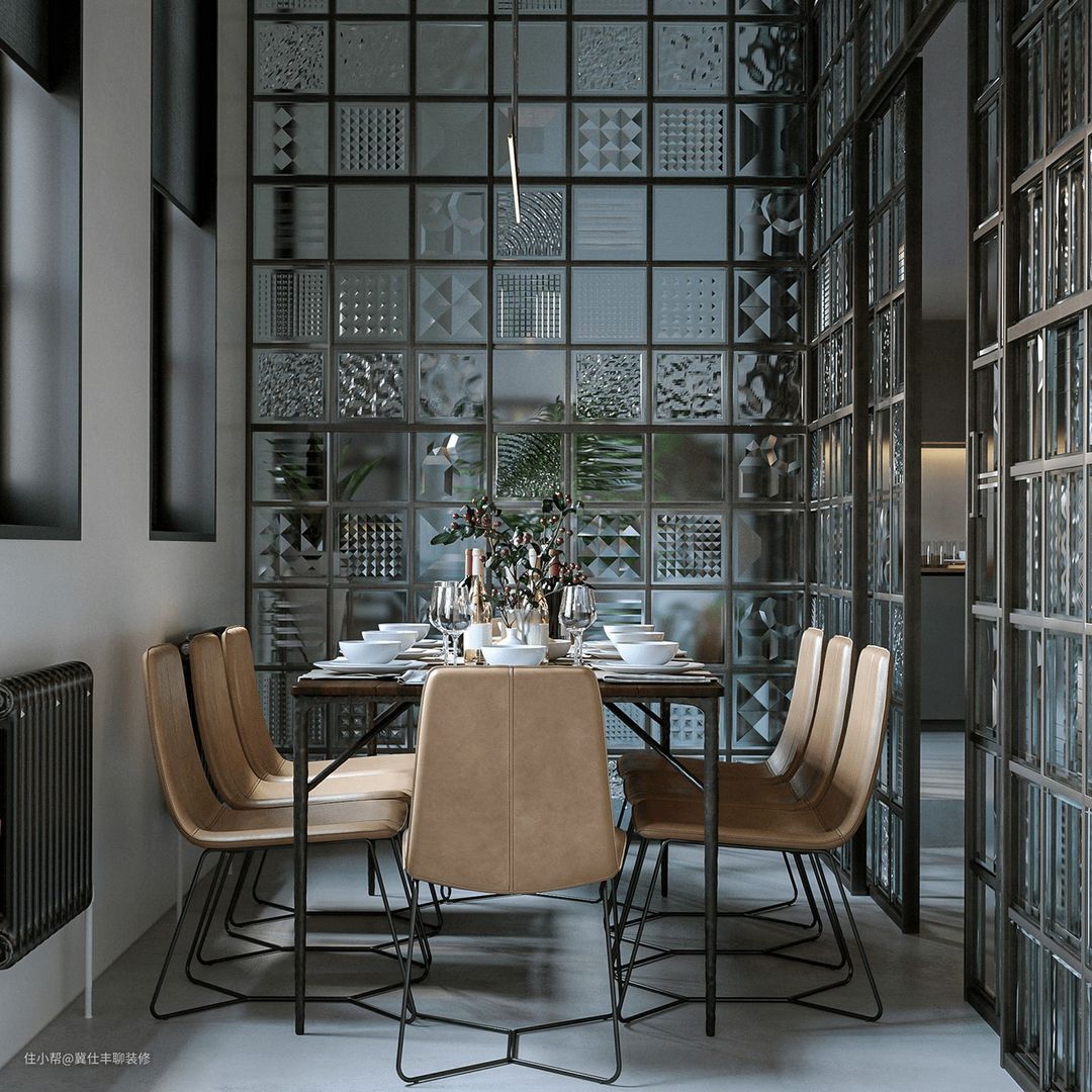 ▲ 这个案例的餐厅隔壁是一个卫生间,设计师选择了这种玻璃砖将餐厅和卫生间隔开,既保证了卫生间的隐私性,又将玻璃砖作为了餐厅的背景墙,真是一举双得!