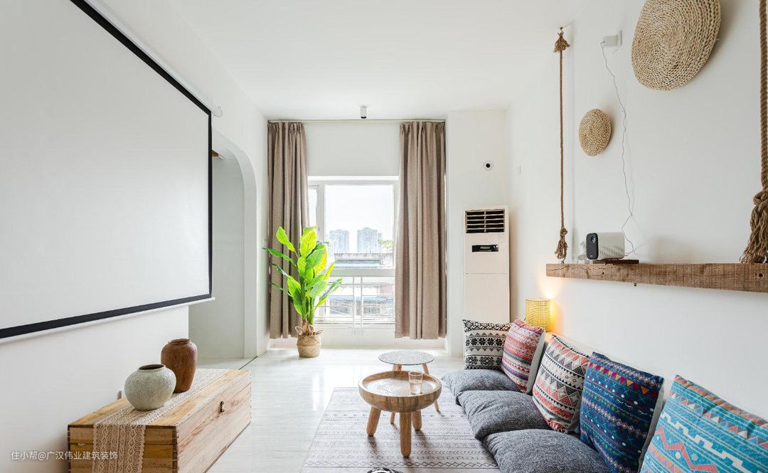 在小户型中,空间有限,直接把幕布安装在窗户的位置,不失为一种不错的选择。建议把幕布安装在窗户窗帘的内侧,这样能有效遮蔽光线,观影效果会更好,也不会使幕布长时间风吹日晒的。