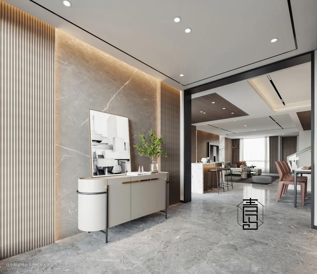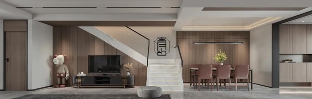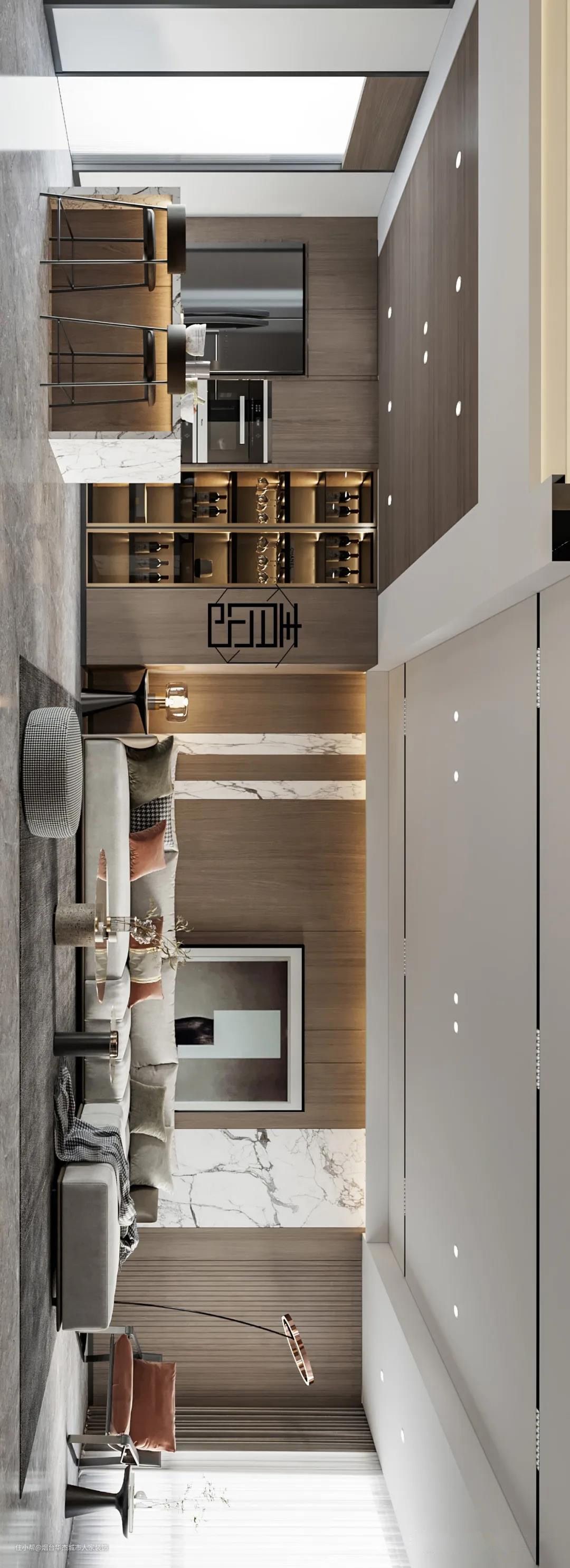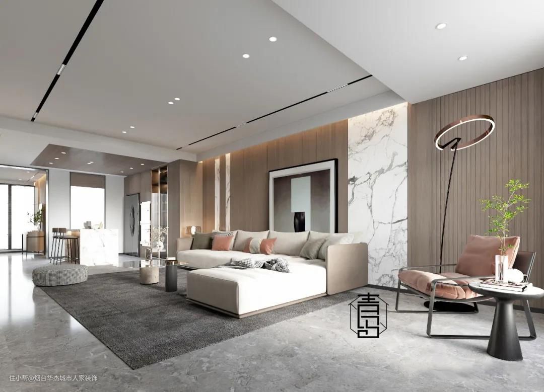 主空间采用无主灯设计,高级感十足,开放的空间布局既增加了视野空间,也不会阻断客厅与其他空间的联系性,带来了视觉景深效果。地面采用的通铺仿大理石瓷砖,质感舒适、纹理自然,在分散式筒灯的渲染下,熠熠生辉。墙面采用墙板与石材拼接的方式,空间更灵动,更富韵味,对比和神韵就有了。