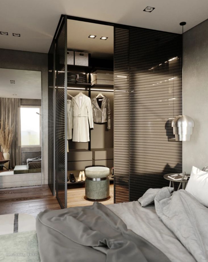 利用墙体隔断,形成一个独立的空间,作为一个单独的衣帽间,这样的衣帽间,不论是防尘性还是收纳性都极强,但最小的独立式衣帽间,都需要四平米以上的空间,所以并不适合小户型安装。