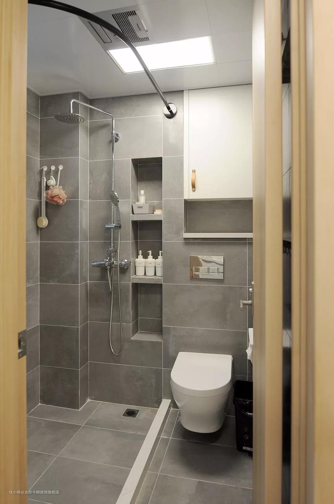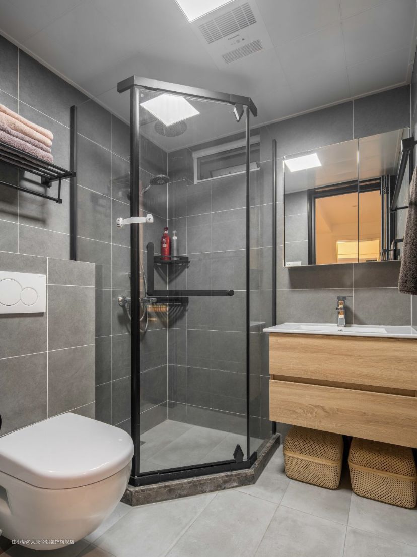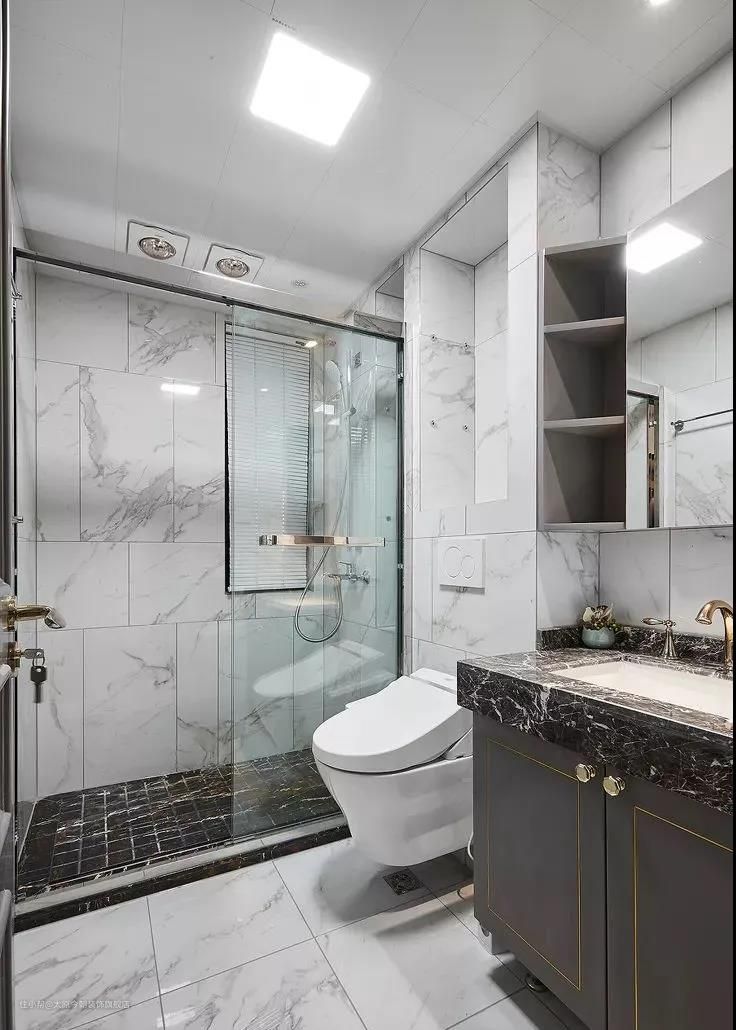 无窗卫生间要防潮,一定要做干湿分离,最常见的方法是将淋浴区、马桶区、洗漱区分开。