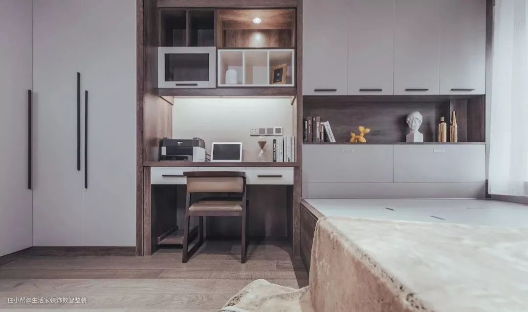▲有时候不一定是房间太小容不下一个床头柜,但又想要书桌又想要化妆台又想要床头柜对很多户型就比较奢侈了,其实书桌或化妆台完全可以「兼职」床头柜的工作,这样就可以一物多用,是小户型常用的一种思路。