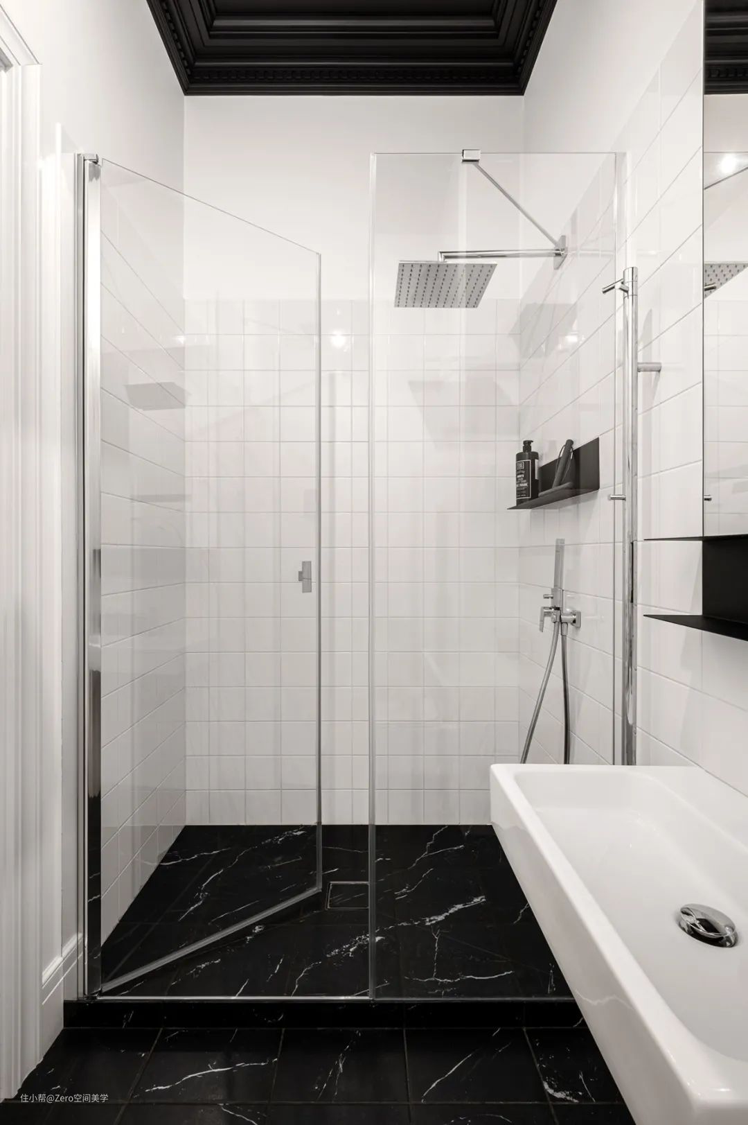 淋浴区装透明玻璃门分隔,避免水花溅出。