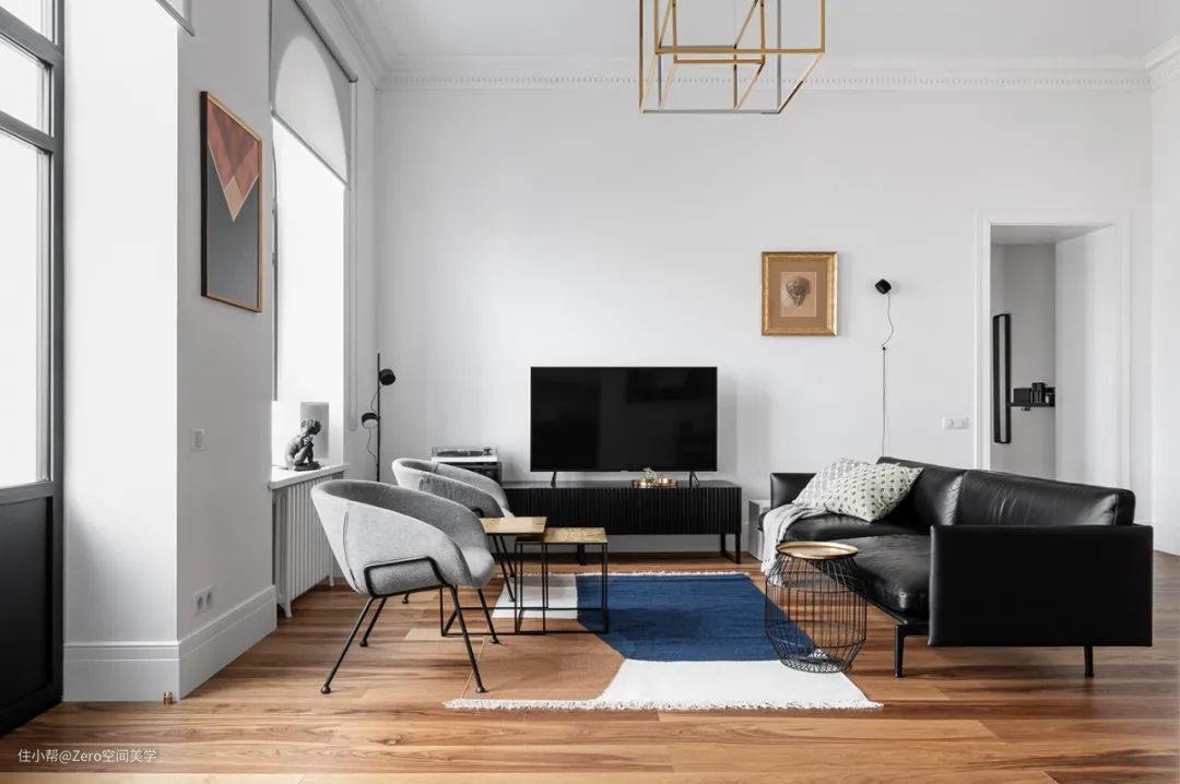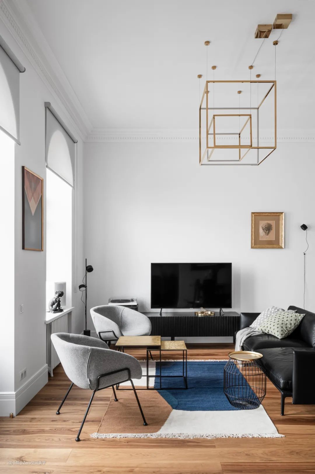 几何图案的地毯在色彩上提亮整个空间,墙上的装饰画和一盏悬垂吊灯引入黄铜金属元素,增加精致高级感。