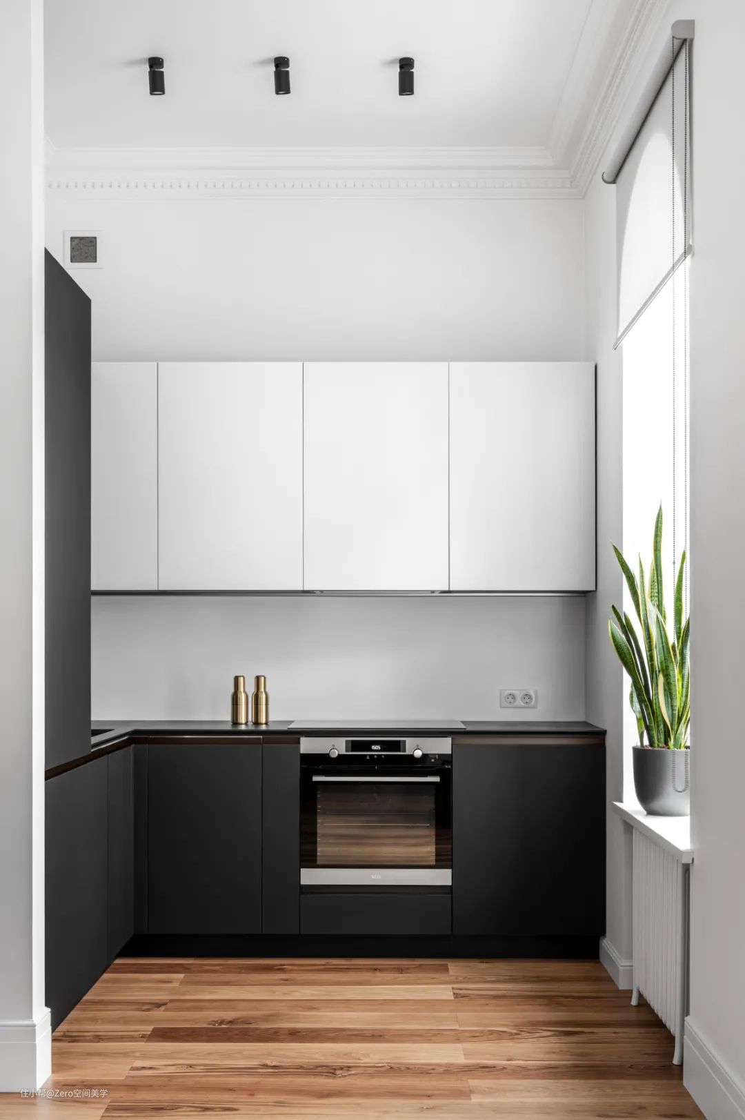 利用结构凹陷布置L型厨房,柜体延续黑白配色,嵌入蒸烤箱,屋主日常准备简餐已够用。