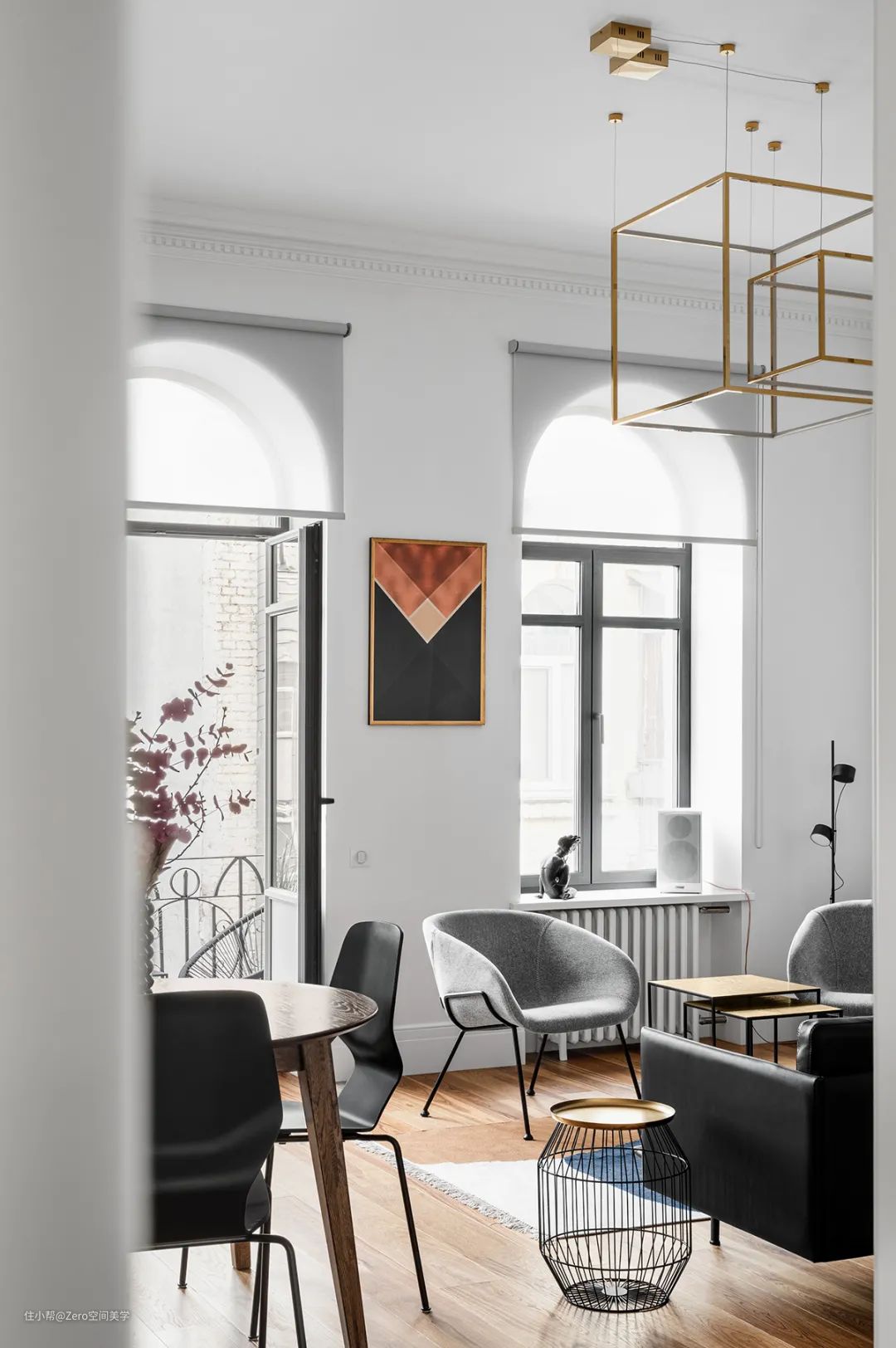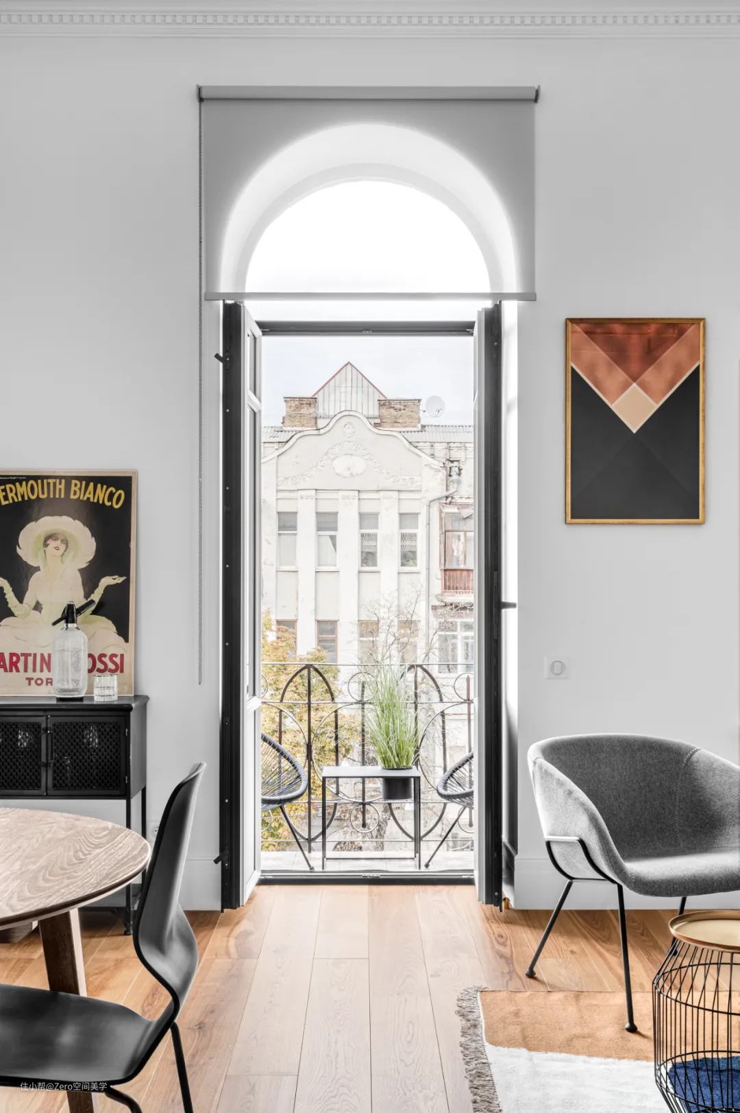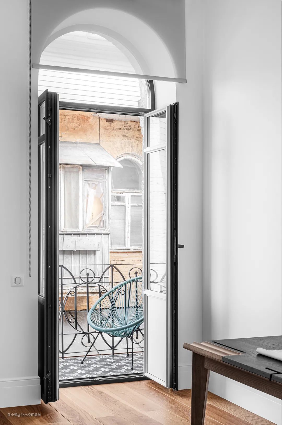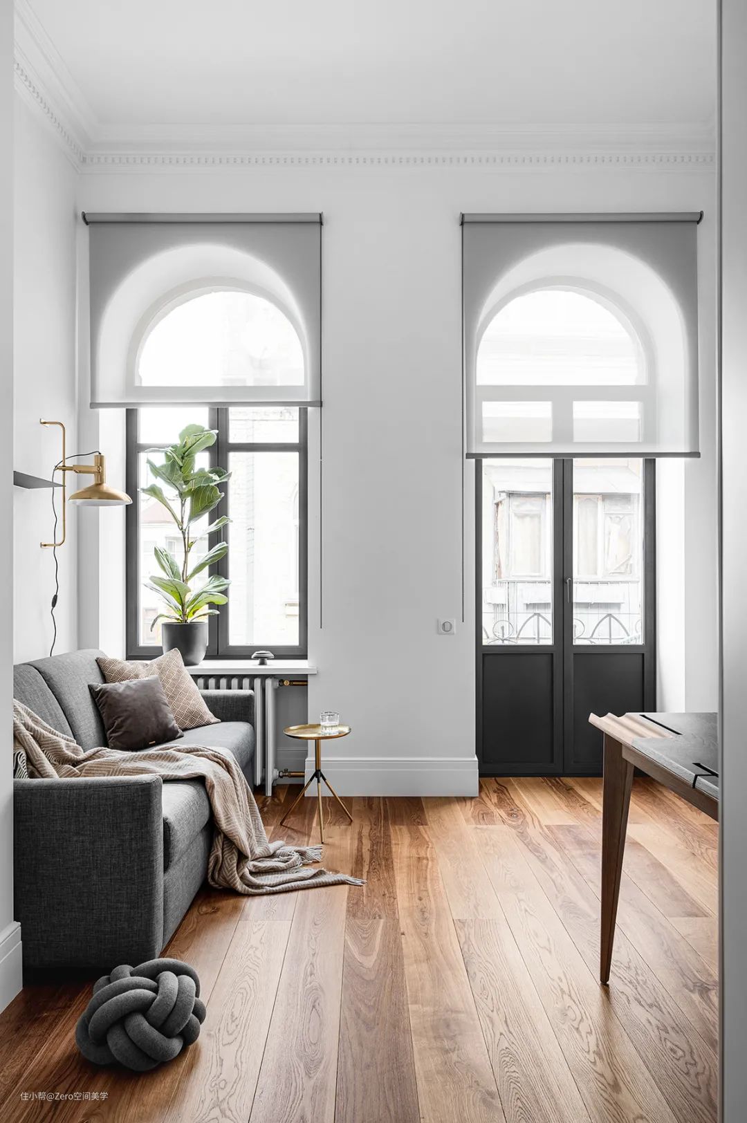 保留原始老建筑的拱形门窗,也是空间的一大亮点,搭配透光拉帘,引入柔和自然光,同时保障私密性。