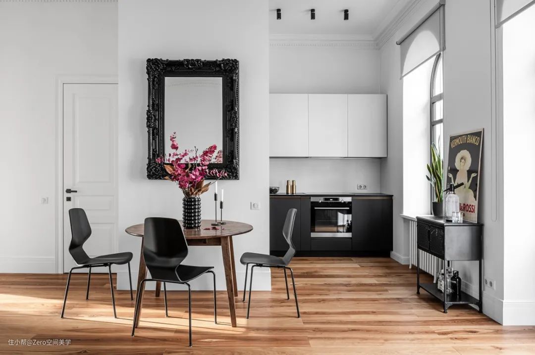 简洁的功能家具、优雅的圆弧门窗、精心挑选的装饰画...搭配雕刻精致的黑色镜框,让空间达到现代古典的和谐统一。