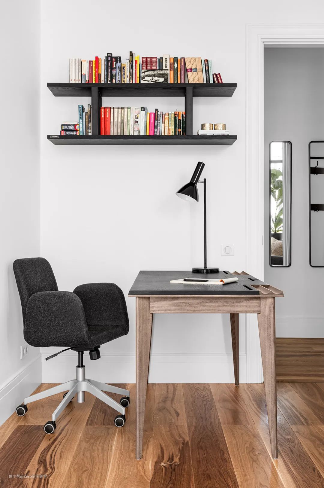 宽大的书桌椅满足工作、学习的需求,墙面设计黑色开放置物架,收纳常看的书籍等。