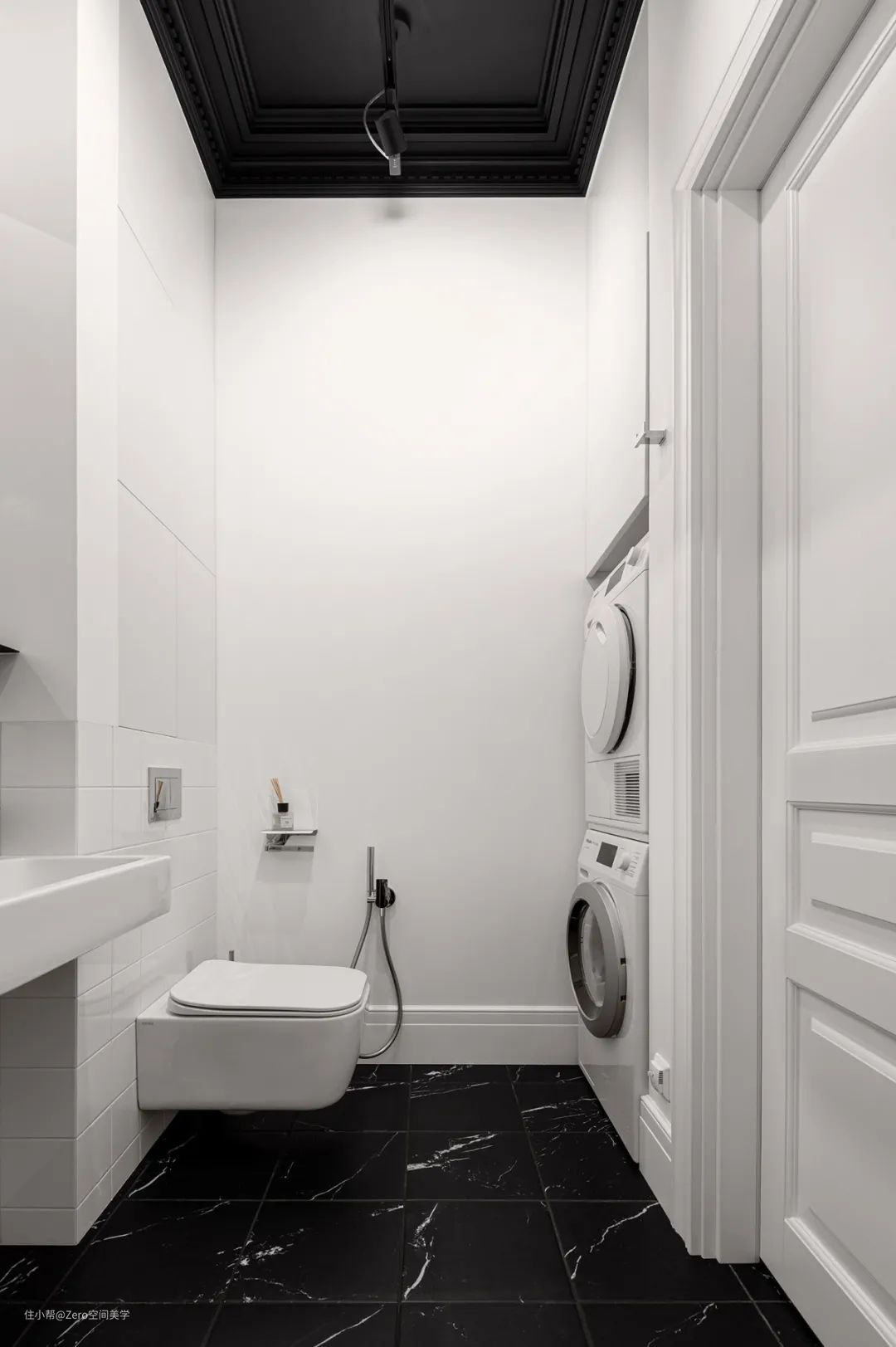 地面铺黑色大理石纹瓷砖,壁挂马桶+清洁喷枪,不留卫生死角,半墙上面还能做一组柜体增加收纳。另一侧利用墙体结构嵌入洗衣机、烘干机,满足衣物洗烘需求。
