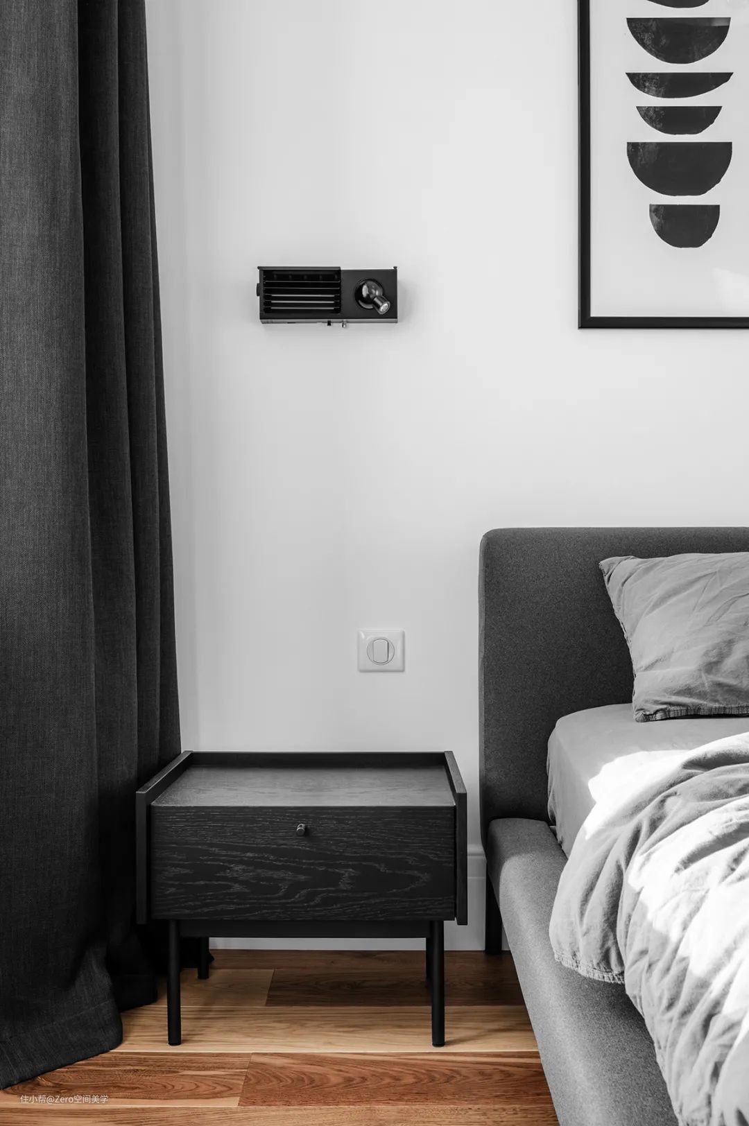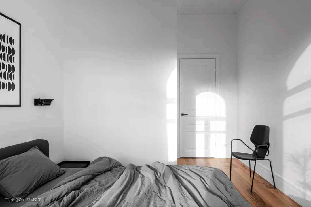 卧室以黑白灰为主,加入一把皮质单椅、一盏金属吊灯点缀,营造静谧舒适的氛围。