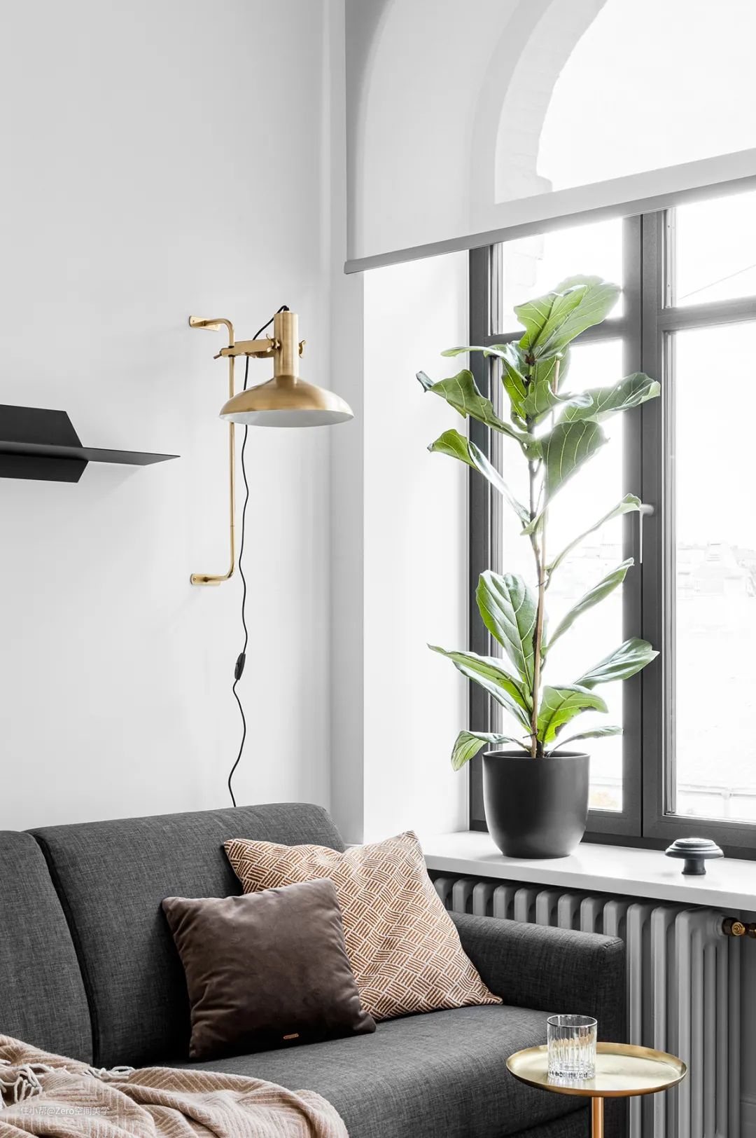 灰色布艺沙发床+壁灯,平时可作为阅读角,偶尔有亲戚朋友来,也能作为临时客房。