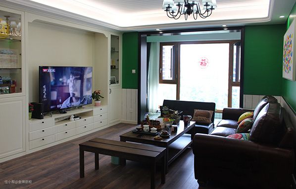 它与白色的电视柜,棕色的皮沙发以及复古做旧墙裙一起,