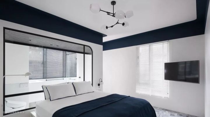 ▲ 卧室天花与墙面以普蓝色乳胶漆衔接,同时以室内窗打通了卧室和卫生间,配合整体的白墙,显得特别的开阔明亮。