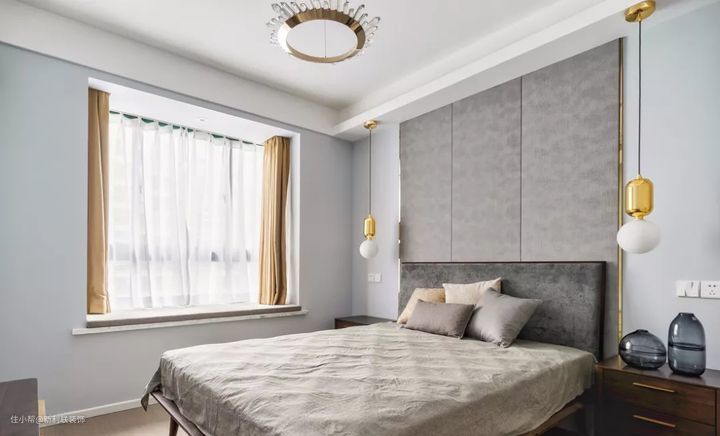 ▲ 卧室,浅灰色硬包,在金色不锈钢条之间更显质感。