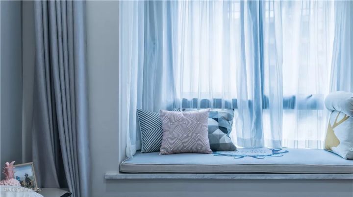 ▲ 卧室整体延续清新明快的空间感,飘窗的米色与蓝色窗帘增加素雅视觉。